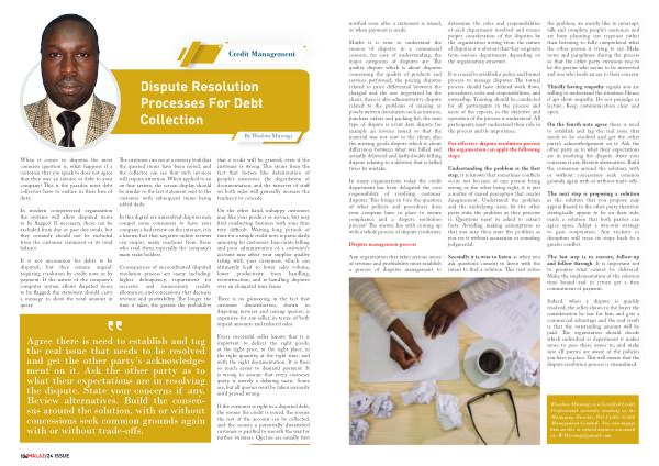 In many organizations today the credit department has been delegated the core responsibility of resolving customer disputes . This brings to fore the question of what policies and procedures does your company have in place to ensure compliance and a dispute resolution process ? The answer lies with coming up with a whole process of dispute resolution .