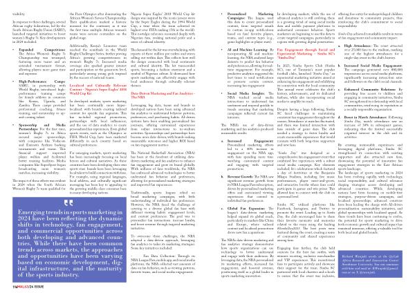 By creating memorable experiences and leveraging digital platforms , Simba SC strengthened its connection with existing supporters and also attracted new fans , showcasing the potential of innovative fan engagement strategies in the East African sports landscape . The landscape of sports marketing in 2024 has been evolving rapidly , with technology , social responsibility , and cultural relevance shaping strategies across developing and advanced countries . While developing nations have been focusing on mobile-first strategies , purpose-driven campaigns , and localized sponsorships , advanced countries have been leading the charge with AI-driven personalization , sustainability initiatives , and global sponsorships with localized appeal . As these trends have been continuing to evolve , the potential for sports marketing to drive both economic growth and cultural impact has remained immense , offering a valuable tool for both local and global brands .