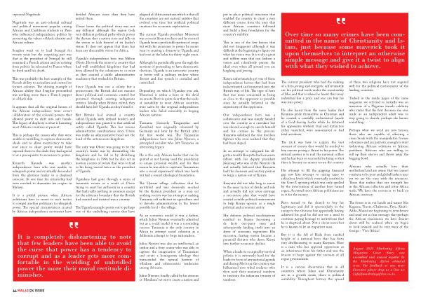 It is completely disheartening to note that few leaders have been able to avoid the curse that power has a tendency to corrupt and as a leader gets more comfortable in the wielding of unbridled power the more their moral rectitude diminishes . plagued all African nations which is that all the countries are not natural entities that evolved over time but artificial political creations for economic exploitation .