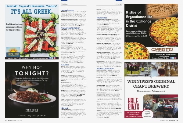Canadian: ONE GREAT CITY BREWING CO Sleek brewpub with a creative menu of elevated bar food. A well-designed dining room makes this spot a hip hang. Sun-Thu 11:30 am-1 am, Fri-Sat 11:30 am-2 am. Entrées: $ 13- $ 22. WA, LP, SP. Cards: AE, IA, MC, V. 1596 Ness Ave, 204-210-2337, Map 2: D-3