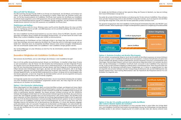 Dennoch kann die Erstellung von Zertifikaten an einer zentralen Stelle in vielen Fällen die richtige Wahl sein , und CodeMeter Certificate Vault bietet eine praktikable Lösung . Das Schlüsselpaar und das signierte Zertifikat werden in der sicheren Umgebung der CA erstellt und dann über den ebenso sicheren Code-