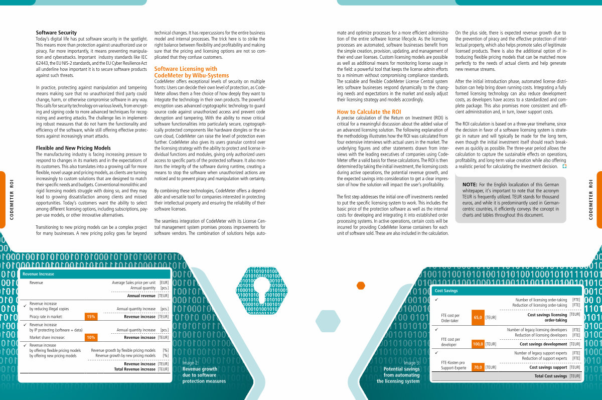 A precise calculation of the Return on Investment( ROI) is critical for a meaningful discussion about the added value of an advanced licensing solution. The following explanation of the methodology illustrates how the ROI was calculated from four extensive interviews with actual users in the market. The underlying figures and other statements drawn from interviews with the leading executives of companies using Code- Meter offer a valid basis for these calculations. The ROI is then determined by taking the initial investment, the licensing costs during active operations, the potential revenue growth, and the expected savings into consideration to get a clear impression of how the solution will impact the user’ s profitability.