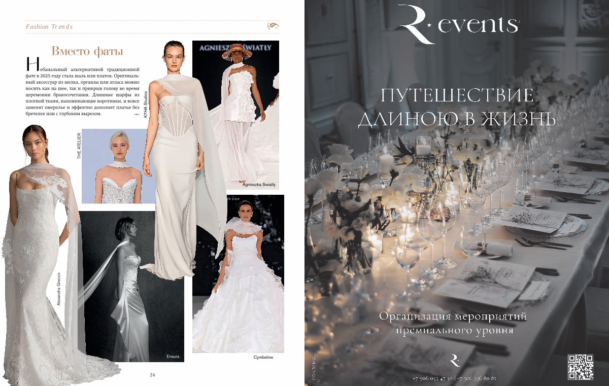 Небанальный альтернативой традиционной фате в 2025 году стала шаль или платок. Оригинальный аксессуар из шелка, органзы или атласа можно носить как на шее, так и прикрыв голову во время церемонии бракосочетания. Длинные шарфы из плотной ткани, напоминающие воротники, и вовсе заменят ожерелье и эффектно дополнят платья без бретелек или с глубоким вырезом.