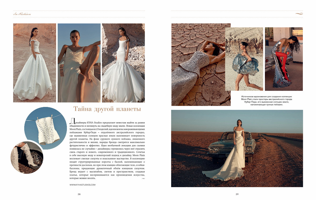 Дизайнеры KYHA Studios предлагают невестам выйти за рамки обыденности и взглянуть на свадебную моду иначе. Новая коллекция Moon Plain, состоящая из 23 изделий, вдохновлена завораживающими пейзажами Кубер-Педи – отдалённого австралийского городка, где выжженная солнцем красная земля напоминает поверхность другой планеты. На фоне сурового лунного пейзажа, лишенного растительности и жизни, наряды бренда смотрятся максимально футуристично и эффектно. Идея необычной локации для съемки появилась не случайно – дизайнеры стремились через неё отразить связь старого и нового, современного и традиционного. Сочетая в себе высокую моду и новаторский подход к дизайну, Moon Plain воспевает смелые силуэты и изысканное мастерство. В коллекцию входят структурированные корсеты с баской, напоминающие о прочности доспехов, но при этом изящно облегающие тело, и юбкибаллоны, придающие драматичный объём изящным силуэтам. Бренд играет с масштабом, светом и пространством, создавая платья, которые воспринимаются как произведения искусства, которые можно носить.