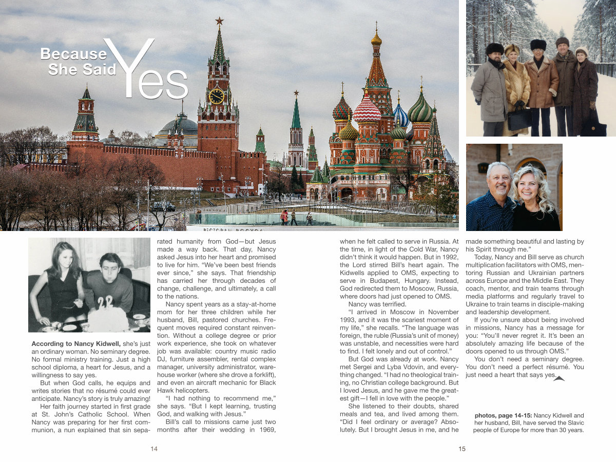 when he felt called to serve in Russia. At the time, in light of the Cold War, Nancy didn’ t think it would happen. But in 1992, the Lord stirred Bill’ s heart again. The Kidwells applied to OMS, expecting to serve in Budapest, Hungary. Instead, God redirected them to Moscow, Russia, where doors had just opened to OMS. Nancy was terrified.“ I arrived in Moscow in November 1993, and it was the scariest moment of my life,” she recalls.“ The language was foreign, the ruble( Russia’ s unit of money) was unstable, and necessities were hard to find. I felt lonely and out of control.”
