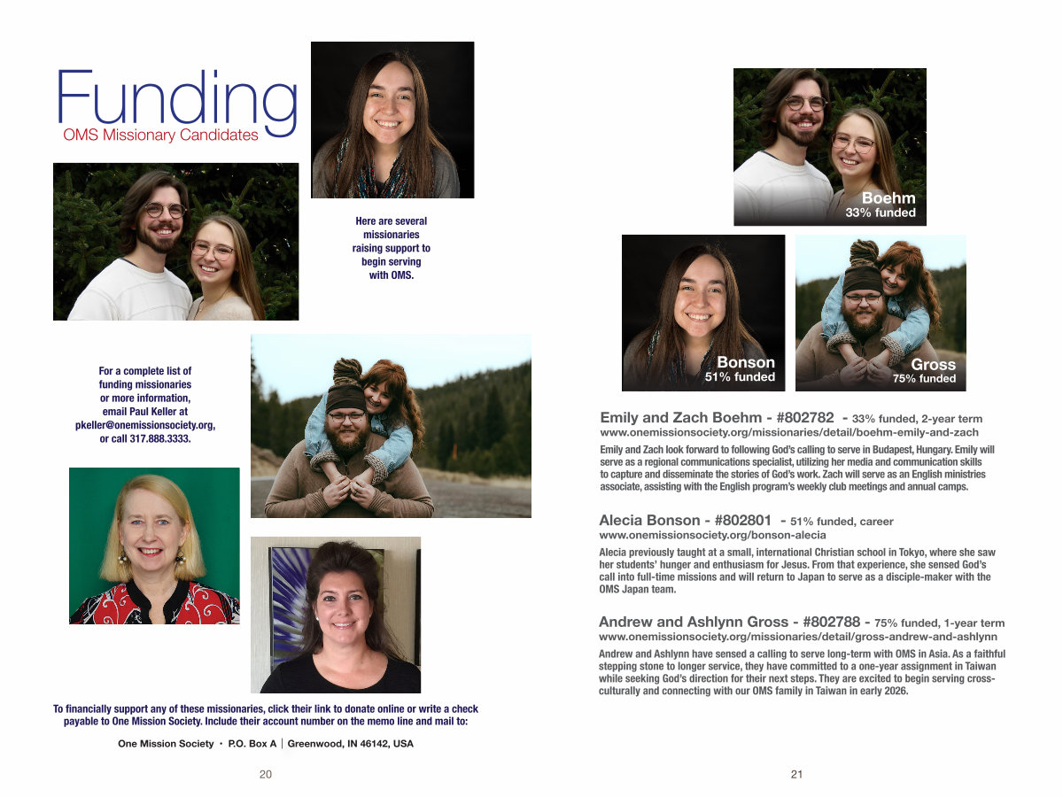 For a complete list of funding missionaries or more information, email Paul Keller at pkeller @ onemissionsociety. org, or call 317.888.3333.