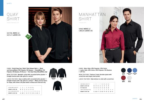 LADIES FEATURES Open neckline with concealed button placket • Straight hemline with side splits for comfort • Waist and bust darts for shape , with sleeve cuff pleat detail on Black and Charcoal only