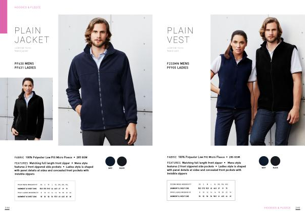 FEATURES Matching full length front zipper • Mens style features 2 front zippered side pockets • Ladies style is shaped with panel details at sides and concealed front pockets with invisible zippers