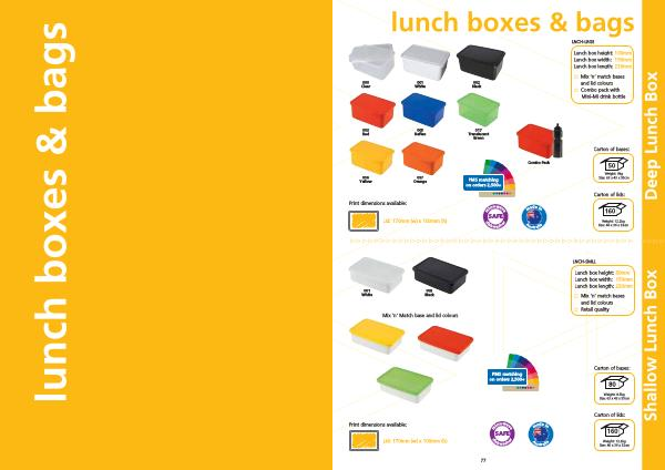77 lunch boxes & bags 50 Weight : 9kg Size : 63 x 43 x 55cm Carton of bases : 80 160 Weight : 8.5kg Size : 63 x 43 x 55cm Weight : 12.2kg Size : 46 x 36 x 32cm Carton of bases : Carton of lids : 160 Weight : 12.2kg Size : 46 x 36 x 32cm Carton of lids : Deep Lunch Box Shallow Lunch Box SAFE dishwasher microwave SAFE dishwasher microwave PMS matching on orders 2,500 + PMS matching on orders 2,500 + Print dimensions available : Print dimensions available : Mix ‘ n ’ Match base and lid colours Lid : 170mm ( w ) x 100mm ( h ) Lid : 170mm ( w ) x 100mm ( h ) Lunch box height : 100mm Lunch box width : 150mm Lunch box length : 220mm LNCH-LRGE Lunch box height : 60mm Lunch box width : 150mm Lunch box length : 220mm LNCH-SMLL Mix ‘ n ’ match bases and lid colours Combo pack with Mini-Mi drink bottle Mix ‘ n ’ match bases and lid colours Retail quality 000 Clear 003 Red 056 Yellow 001 White 001 White 005 Reflex 057 Orange 002 Black 002 Black 017 Translucent Green made in Australia made in Australia made in BPA free uv colour reactive friendly plastic Australia custom moulding SAFE made in Australia made in Australia made in dishwasher microwave BPA free Combo Pack