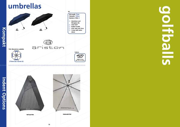 92 umbrellas Kompakt Indent Options Full Panel Print Underneath Print o Aluminium and Fibreglass ribs o Steel shaft o Rubber handle o Auto open and close o Comes with nylon sleeve 36 Weight : 12.9 kg Size : 32 x 31.5 x 32cm Carton : 270mm ( w ) x 62mm ( h ) Print dimensions available : 202 Black 201 Navy KU Rib length : 79cm Diameter : 135cm Number of Rib : 8