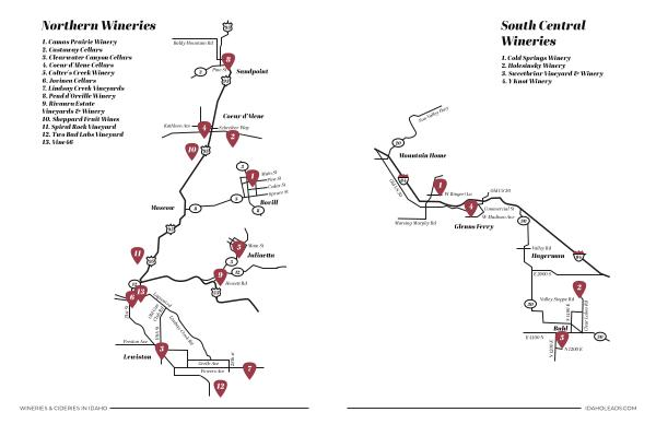 1 . Camas Prairie Winery 2 . Castaway Cellars 3 . Clearwater Canyon Cellars 4 . Coeur d ' Alene Cellars 5 . Colter ' s Creek Winery 6 . Jovinea Cellars 7 . Lindsay Creek Vineyards 8 . Pend d ' Oreille Winery 9 . Rivaura Estate Vineyards & Winery 10 . Sheppard Fruit Wines 11 . Spiral Rock Vineyard 12 . Two Bad Labs Vineyard 13 . Vine46