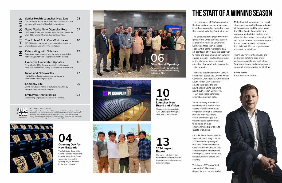 Winning Spirit Magazine is the official employee publication of the Larry H. Company. Its purpose is to document important events and milestones, as well as share the successes and achievements of our employees as they exemplify the mission, vision, values, and guiding principles of the company. Please send your comments, questions, and article suggestions to winningspirit @ lhm. com.