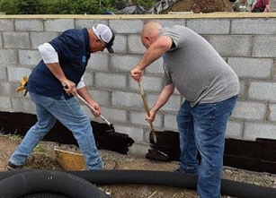 Sam Austin (left) and Brett Fulghum were among several Cox Communications volunteers teaming up with Habitat for Humanity to build safe, affordable homes for families in Roanoke, Virginia. From waterproofing the foundation to cutting wood, their sweat equity will make a lasting impact on the community and in people’s lives.