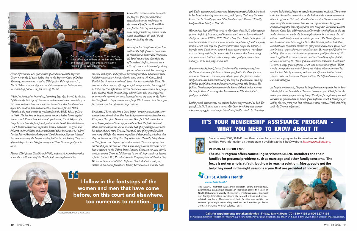 Never before in the 137-year history of the North Dakota Supreme Court, nor in the 28 years before that on the Supreme Court of Dakota Territory, has a woman served as Chief Justice. Before January 1st, North Dakota was one of just seven states who had not had a woman serve as Chief Justice. I’ m glad we’ re off the list.