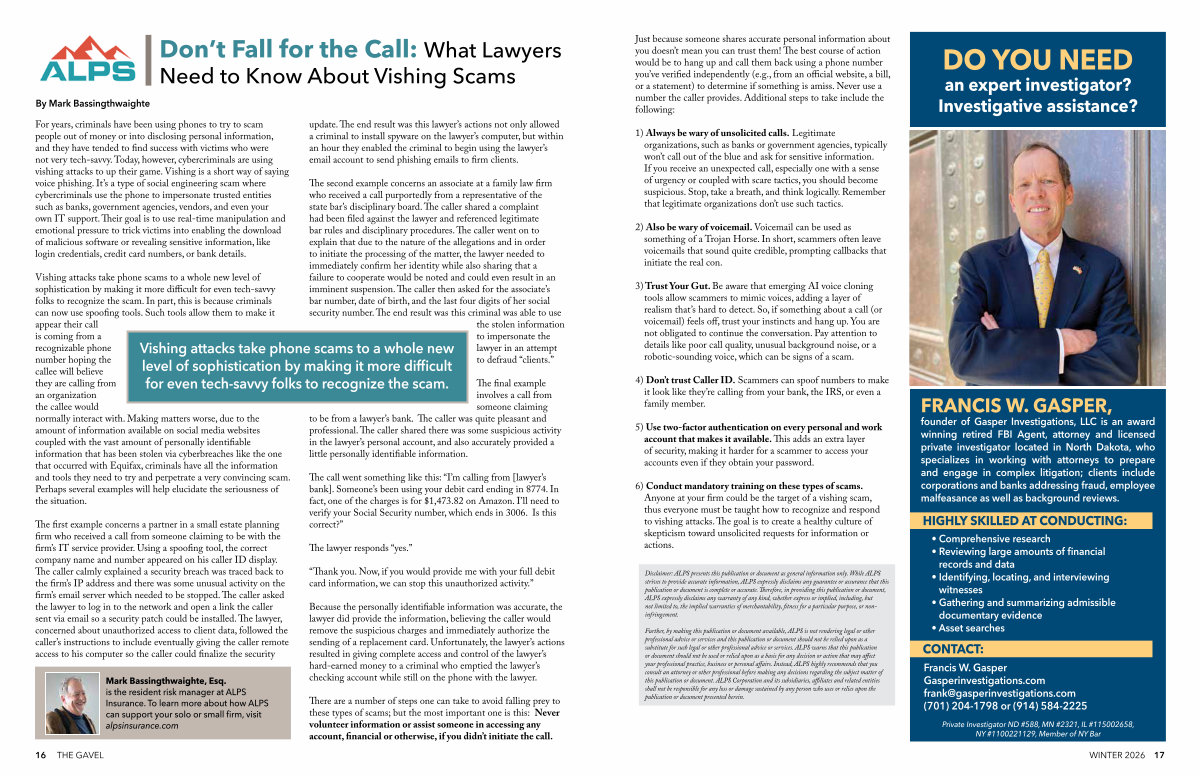 FRANCIS W. GASPER, founder of Gasper Investigations, LLC is an award winning retired FBI Agent, attorney and licensed private investigator located in North Dakota, who specializes in working with attorneys to prepare and engage in complex litigation; clients include corporations and banks addressing fraud, employee malfeasance as well as background reviews.