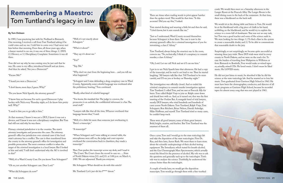 In 1985, I was practicing law with Irv Nodland in Bismarck. One morning, I received a call from Tom Tuntland asking if he could come and see me. I told him to come over. I had never met him before that morning. Even then, all those years ago, when a lawyer wanted to see me, it was one of three things: 1.) DUI; 2.) Divorce; or 3.) Disciplinary Complaint. Sometimes it was all three.