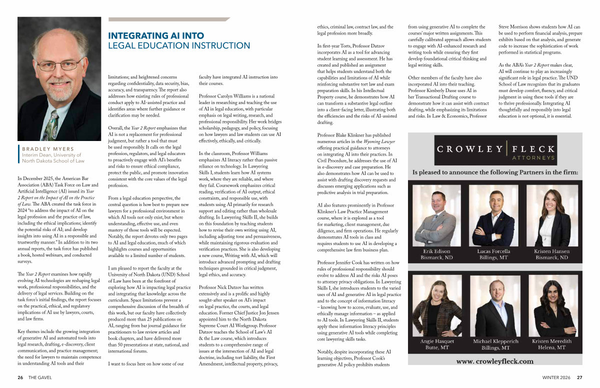 I am pleased to report the faculty at the University of North Dakota( UND) School of Law have been at the forefront of exploring how AI is impacting legal practice and integrating that knowledge across the curriculum. Space limitations prevent a comprehensive discussion of the breadth of this work, but our faculty have collectively produced more than 25 publications on AI, ranging from bar journal guidance for practitioners to law review articles and book chapters, and have delivered more than 50 presentations at state, national, and international forums.
