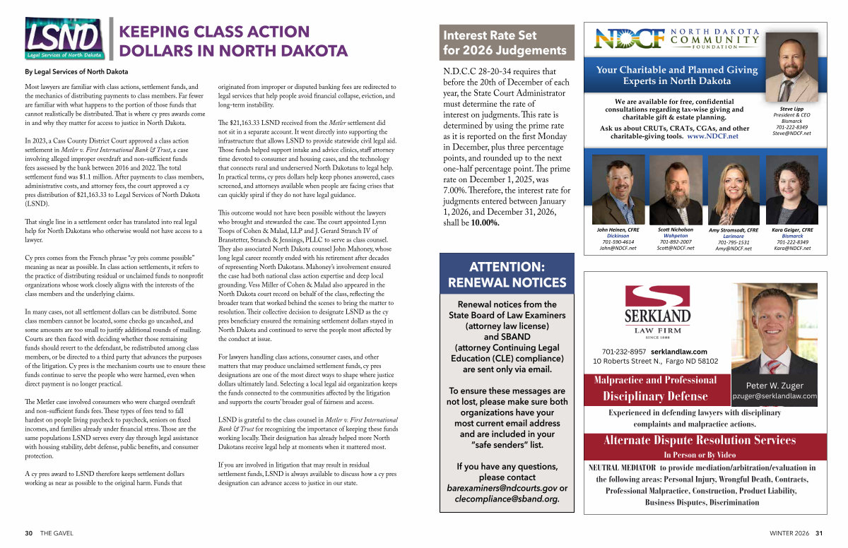 In 2023, a Cass County District Court approved a class action settlement in Metler v. First International Bank & Trust, a case involving alleged improper overdraft and non-sufficient funds fees assessed by the bank between 2016 and 2022. The total settlement fund was $ 1.1 million. After payments to class members, administrative costs, and attorney fees, the court approved a cy pres distribution of $ 21,163.33 to Legal Services of North Dakota( LSND).