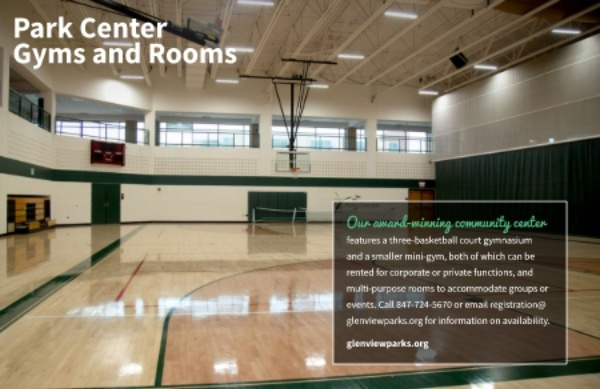 Our award-winning community center features a three-basketball court gymnasium and a smaller mini-gym , both of which can be rented for corporate or private functions , and multi-purpose rooms to accommodate groups or events . Call 847-724-5670 or email registration @ glenviewparks . org for information on availability .