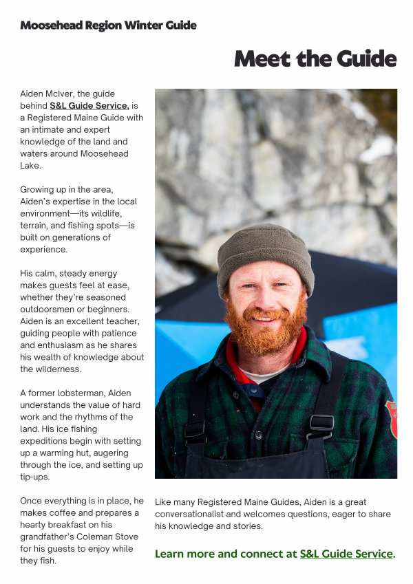 Aiden McIver, the guide behind S & L Guide Service, is a Registered Maine Guide with an intimate and expert knowledge of the land and waters around Moosehead Lake.