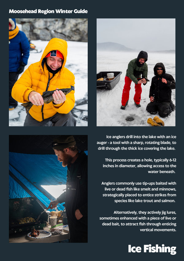 Ice anglers drill into the lake with an ice auger- a tool with a sharp, rotating blade, to drill through the thick ice covering the lake.