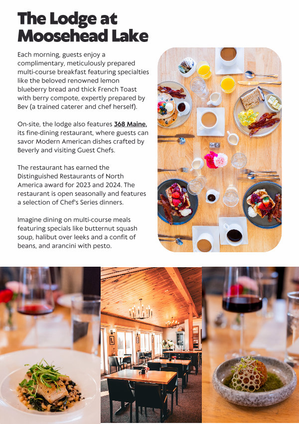 On-site, the lodge also features 368 Maine, its fine-dining restaurant, where guests can savor Modern American dishes crafted by Beverly and visiting Guest Chefs.
