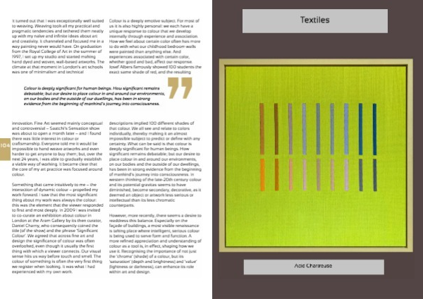 Something that came intuitively to me – the interaction of dynamic colour – propelled my work forward. I saw that the most significant thing about my work was always the colour: this was the element that the viewer responded to first and most deeply. In 2009 I was invited to co-curate an exhibition about colour in London at the Aram Gallery by its then curator, Daniel Charny, who consequently coined the title (of the show) and the phrase ‘Significant Colour’. We agreed that across fine art and design the significance of colour was often overlooked, even though it usually the first thing with which a viewer connects. Our visual sense hits us way before touch and smell. The colour of something is often the very first thing we register when looking. It was what I had experienced with my own work.