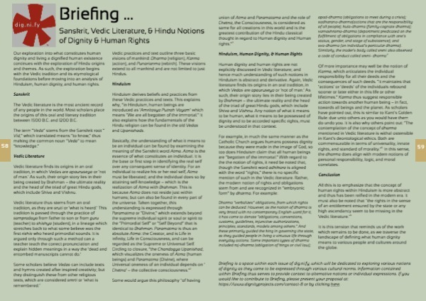 Our exploration into what constitutes human dignity and living a dignified human existence continues with the exploration of Hindu origins and themes. As such, the exploration begins with the Vedic tradition and its etymological foundations before moving into an analysis of Hinduism, human dignity, and human rights.