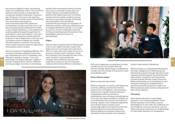 platform that empowered students and held instructors accountable through data and metrics, Minerva succeeded in building a platform that flipped instruction on its head. Teachers became guides, students pursued learning not just online through consciously structured global and multicultural environments but through the acquisition of skills that could be used across disciplines and in multiple professional settings. It is a model for our time, one that challenges traditional thinking by breaking down the barriers of how knowledge is gained and how it is demonstrated.