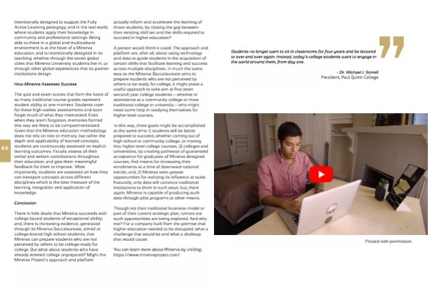 In this way, three goals might be accomplished at the same time: 1) students will be better prepared to succeed, whether coming out of high school or community college, or moving into higher level college courses; 2) colleges and universities, by creating pathways of guaranteed acceptance for graduates of Minerva designed courses, find means for increasing their enrollments at a time of downward national trends; and, 3) Minerva sees greater opportunities for realizing its influence at scale. Naturally, only data will convince traditional institutions to think in such ways: but, there again, Minerva is capable of producing such data through pilot programs or other means.