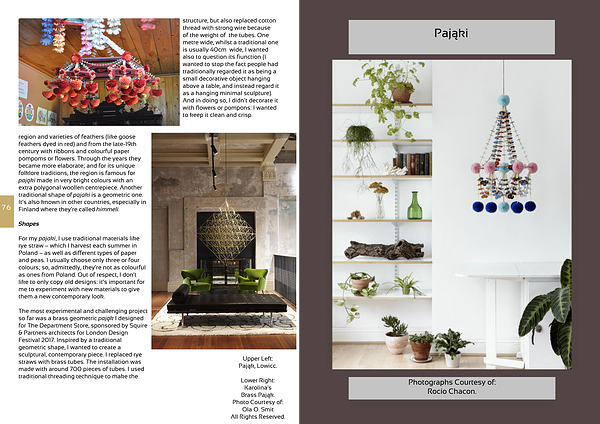 The most experimental and challenging project so far was a brass geometric pająk I designed for The Department Store, sponsored by Squire & Partners architects for London Design Festival 2017. Inspired by a traditional geometric shape, I wanted to create a sculptural, contemporary piece. I replaced rye straws with brass tubes. The installation was made with around 700 pieces of tubes. I used traditional threading technique to make the