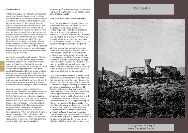 Antonio’s instincts were correct, and the concept was first sold to an American, a woman from Santa Fe, New Mexico, who had started Sotheby’s international real estate magazine. Antonio and his son – who had lived in London since he was 13 and had become trained and licensed as an architect – never looked back. Since completion of the first two properties, Benedikt moved to Reschio. He has now overseen the design, remodel, and sale of 28 total properties. Profits from the sale of homes, which range in price from 5.5 million to 20 million euros, went into capital improvements – roads, water, sewers, etc. – that would serve to upgrade other homes on the property. Ultimately, profits became enough to start work on the castle in 2015. To date, all has been done without taking on debt.