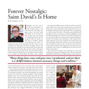 It was with this in mind that I visited Saint David ’ s a few weeks ago . While I had been back to Saint David ’ s several times over the years , I had been unable to tour the new building that was opened in 2018 . The school had certainly changed , it had seemingly doubled in size , and I wondered whether what made my Saint David ’ s experience special remained . I had memories of the large spiral staircases , the unique smell of the library , and the cafeteria which served as gym and stage , depending on the evening . Walking through the townhouses brought back a flood of memories . Much remained the same : the staircases were there , as were the classrooms where I spent so much time . However , much had also changed . The classrooms were configured differently , the school seemed brighter and better lit , and there was a sense of space which I had not remembered . This space came from the new building which was seamlessly connected to the old . The hallways , which I recalled from my youth , organically flowed into this new space which still seemed brand new . The gym on the top floor was crowded with fourth graders playing basketball , while students on floors below went about their daily tasks . The new auditorium was impressive , much nicer than the stages I came across in high school or college . In many ways , it seemed like an entirely different place , one that I could not have imagined as a boy walking those same halls . minute to learn my way around . If you haven ’ t been back in the last couple of years , you may not recognize as much as you had hoped . But what made Saint David ’ s our school remains . Saint David ’ s boys are the same as they were in generations past . They may use different technology , and inhabit a different space , but they are still Saint David ’ s boys . Much of the faculty and staff may be new to you ( although , there are still several familiar faces !), but they carry on the mission and purpose of their predecessors . While we will never return to Saint David ’ s exactly as it was when we wandered its halls , it still is a home for us . •