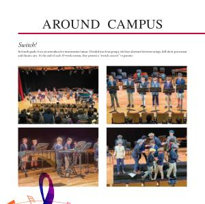 In fourth grade , boys are introduced to instrumental music . Divided into four groups , the boys alternate between strings , bell choir , percussion and theatre arts . At the end of each 10-week session , they present a “ switch concert ” to parents .