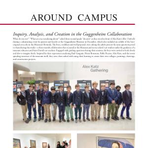 What do you see ?” “ What are you wondering about ?” asked three second-grade “ docents ” as they stood in front of Alex Katz ’ s Blue Umbrella during a culminating event for parents and faculty at the Guggenheim Museum in December , which also included an exhibit of the boys ’ original artworks in the Museum ’ s Rotunda . The boys , confident and well prepared , were asking the adults present the same questions posed to them during this study — a three-month collaboration that occurred at the Museum and in our school ’ s art studios under the guidance of a museum educator and Saint David ’ s art teachers . Engaged with guiding questions during their sessions , the boys were invited to look closely and also to imagine freely . Inspired by their experiences analyzing Paul Gauguin , Henri Rousseau , Pablo Picasso , Alex Katz , and the iconic spiraling structure of the museum itself , they were then tasked with using their learning to create their own collages , paintings , drawings , and construction projects .