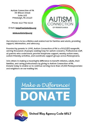 Founded by parents in 1995, Autism Connection of PA is a 501(c)(3) nonprofit, serving thousands of people seeking help for autism concerns. Professional staff, all parents who understand, provide telephone support, weekly autism news, autism-friendly activities, and coordinate support groups across Pennsylvania.