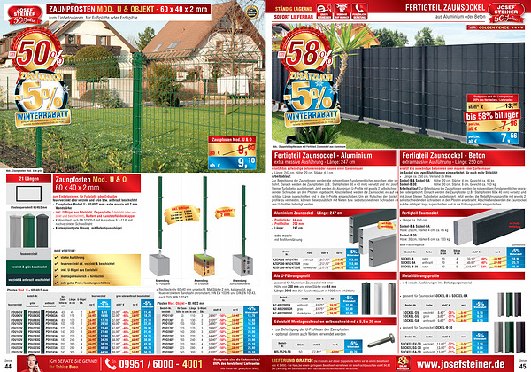 Höhe: 30 cm, Stärke: 6 cm, Gewicht: ca. 103 kg Arbeitsablauf: Zur Befestigung der Zaunpfosten werden die notwendigen Fundamentlöcher gegraben oder gebohrt. Danach werden die Zaunpfosten( z. B.: Stahlpfosten 60 x 40 mm) versetzt und mit Josef Steiner Turbobeton ausbetoniert. Jetzt werden die Metallführungsprofile mit jeweils 2 selbstschneidenden Schrauben an den Pfosten angebracht. Abschließend werden die Zaunsockel, auf die richtige Länge zugeschnitten und in die Führungsprofile eingeschoben.