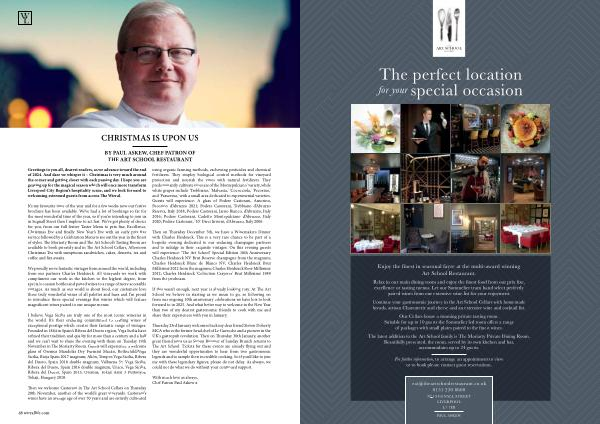 It ’ s my favourite time of the year and for a few weeks now our festive brochure has been available . We ’ ve had a lot of bookings so far for the most wonderful time of the year , so if you ’ re intending to join us in Sugnall Street then I implore to act fast . We ’ ve got plenty of choice for you , from our full festive Taster Menu to prix fixe , Excellence , Christmas Eve and finally New Year ’ s Eve with an early prix fixe service followed by a Celebration Menu to see out the year in the finest of styles . The Moriarty Room and The Art School ’ s Tasting Room are available to book privately and in The Art School Cellars , Afternoon Christmas Tea with sumptuous sandwiches , cakes , desserts , tea and coffee and fizz awaits .