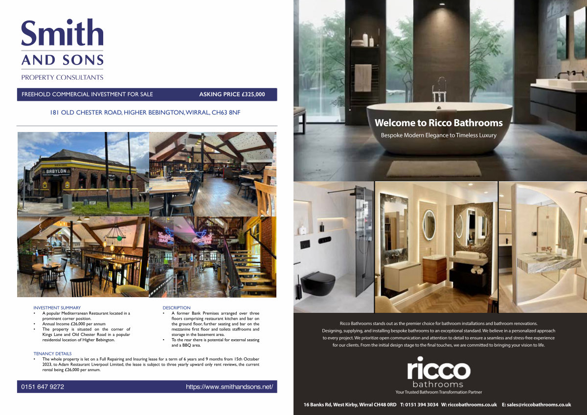 • The whole property is let on a Full Repairing and Insuring lease for a term of 6 years and 9 months from 15th October 2023, to Adam Restaurant Liverpool Limited, the lease is subject to three yearly upward only rent reviews, the current rental being £ 26,000 per annum.