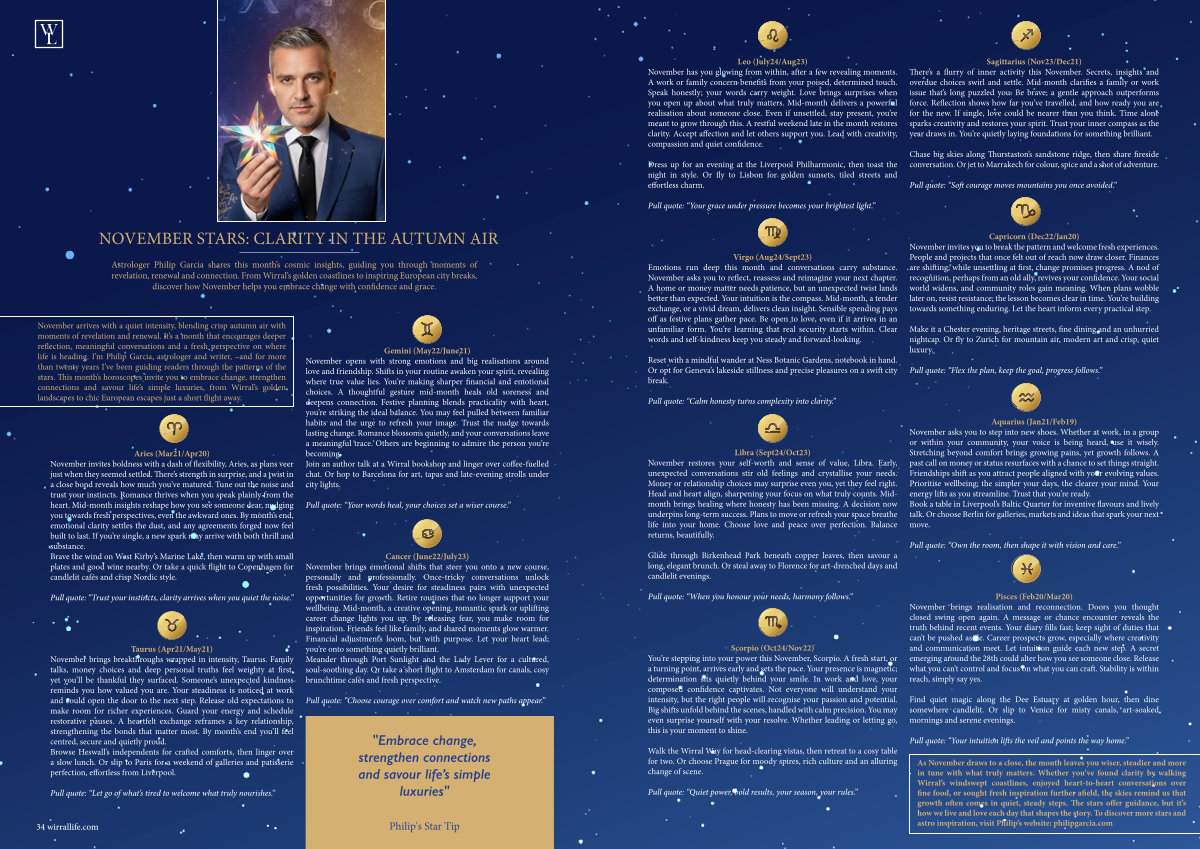 As November draws to a close, the month leaves you wiser, steadier and more in tune with what truly matters. Whether you’ ve found clarity by walking Wirral’ s windswept coastlines, enjoyed heart-to-heart conversations over fine food, or sought fresh inspiration further afield, the skies remind us that growth often comes in quiet, steady steps. The stars offer guidance, but it’ s how we live and love each day that shapes the story. To discover more stars and astro inspiration, visit Philip’ s website: philipgarcia. com