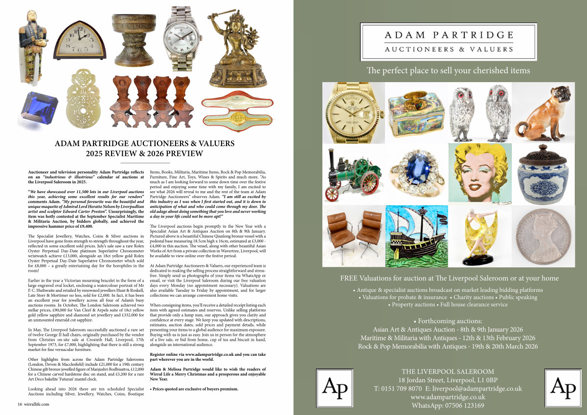 Items, Books, Militaria, Maritime Items, Rock & Pop Memorabilia, Furniture, Fine Art, Toys, Wines & Spirits and much more.“ As much as I am looking forward to some down time over the festive period and enjoying some time with my family, I am excited to see what 2026 will reveal to me and the rest of the team at Adam Partridge Auctioneers” observes Adam.“ I am still as excited by this industry as I was when I first started out, and it is down to anticipation of what and who could come through my door. The old adage about doing something that you love and never working a day in your life could not be more apt!”