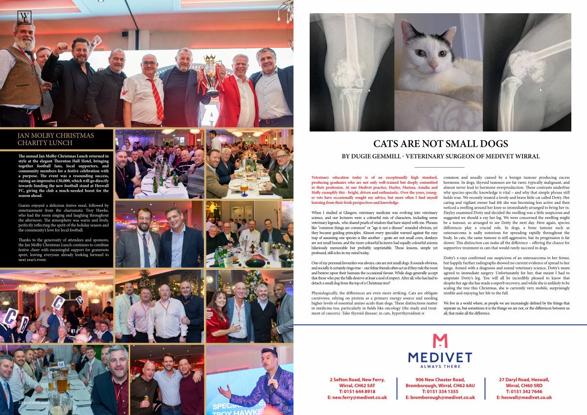 Physiologically, the differences are even more striking. Cats are obligate carnivores, relying on protein as a primary energy source and needing higher levels of essential amino acids than dogs. These distinctions matter in medicine too, particularly in fields like oncology( the study and treatment of cancers). Take thyroid disease: in cats, hyperthyroidism is common and usually caused by a benign tumour producing excess hormone. In dogs, thyroid tumours are far rarer, typically malignant, and almost never lead to hormone overproduction. These contrasts underline why species-specific knowledge is vital – and why that simple phrase still holds true. We recently treated a lovely and brave little cat called Dotty. Her caring and vigilant owner had felt she was becoming less active and then noticed a swelling around her knee so immediately arranged to bring her in. Hayley examined Dotty and decided the swelling was a little suspicious and suggested we should x-ray her leg. We were concerned the swelling might be a tumour, so arranged to see Dotty the next day. Here again, species differences play a crucial role. In dogs, a bone tumour such as osteosarcoma is sadly notorious for spreading rapidly throughout the body. In cats, the same tumour is still aggressive, but its progression is far slower. This distinction can make all the difference – offering the chance for supportive treatment in cats that would rarely succeed in dogs.