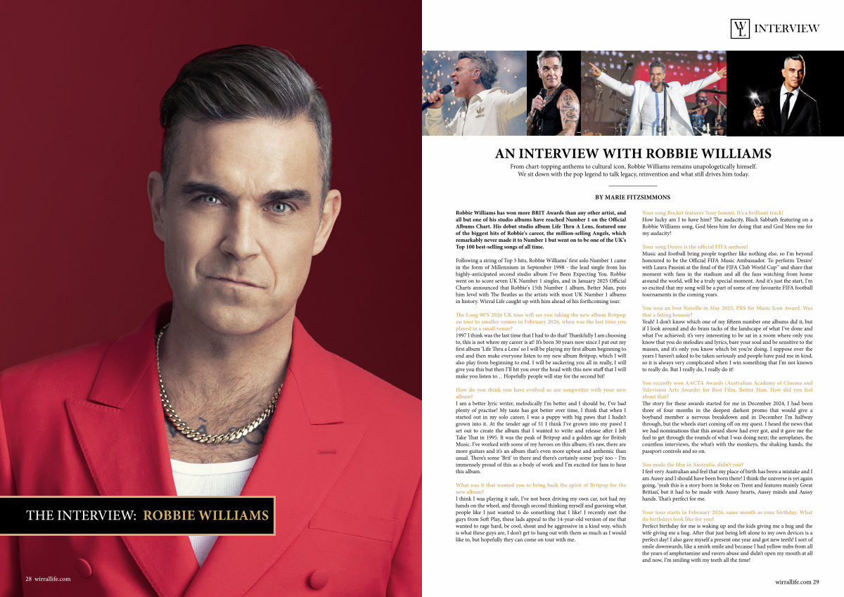 Following a string of Top 5 hits, Robbie Williams ' first solo Number 1 came in the form of Millennium in September 1998- the lead single from his highly-anticipated second studio album I ' ve Been Expecting You. Robbie went on to score seven UK Number 1 singles, and in January 2025 Official Charts announced that Robbie ' s 15th Number 1 album, Better Man, puts him level with The Beatles as the artists with most UK Number 1 albums in history. Wirral Life caught up with him ahead of his forthcoming tour.