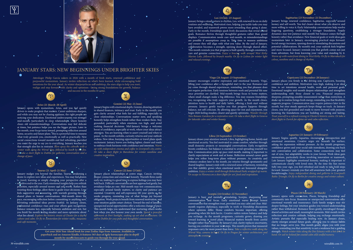 Leo( 24 July – 23 August) January brings a steady return to rhythm, Leo, with renewed focus on daily routines and wellbeing. Motivation rises, helping you tackle tasks you may have avoided, and teamwork proves more rewarding than going it alone. Early in the month, friendships spark lively discussions that reveal shared goals. Romance thrives through thoughtful gestures rather than grand displays. Communication needs care mid-month, as misunderstandings are possible if assumptions creep in. Take time to reassess ambitions and ensure they still align with what you value. By the end of January, collaboration becomes a strength, opening doors through shared effort. This month reminds you that progress is built quietly, through consistency, care and genuine connection. Enjoy a bracing walk around West Kirby Marine Lake, followed by brunch nearby. Or fly to Lisbon for winter light and relaxed evenings.