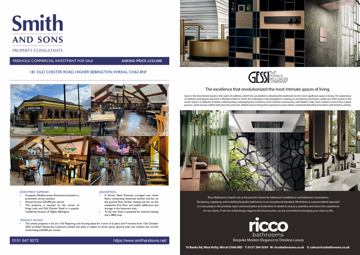 • The whole property is let on a Full Repairing and Insuring lease for a term of 6 years and 9 months from 15th October 2023, to Adam Restaurant Liverpool Limited, the lease is subject to three yearly upward only rent reviews, the current rental being £ 26,000 per annum.