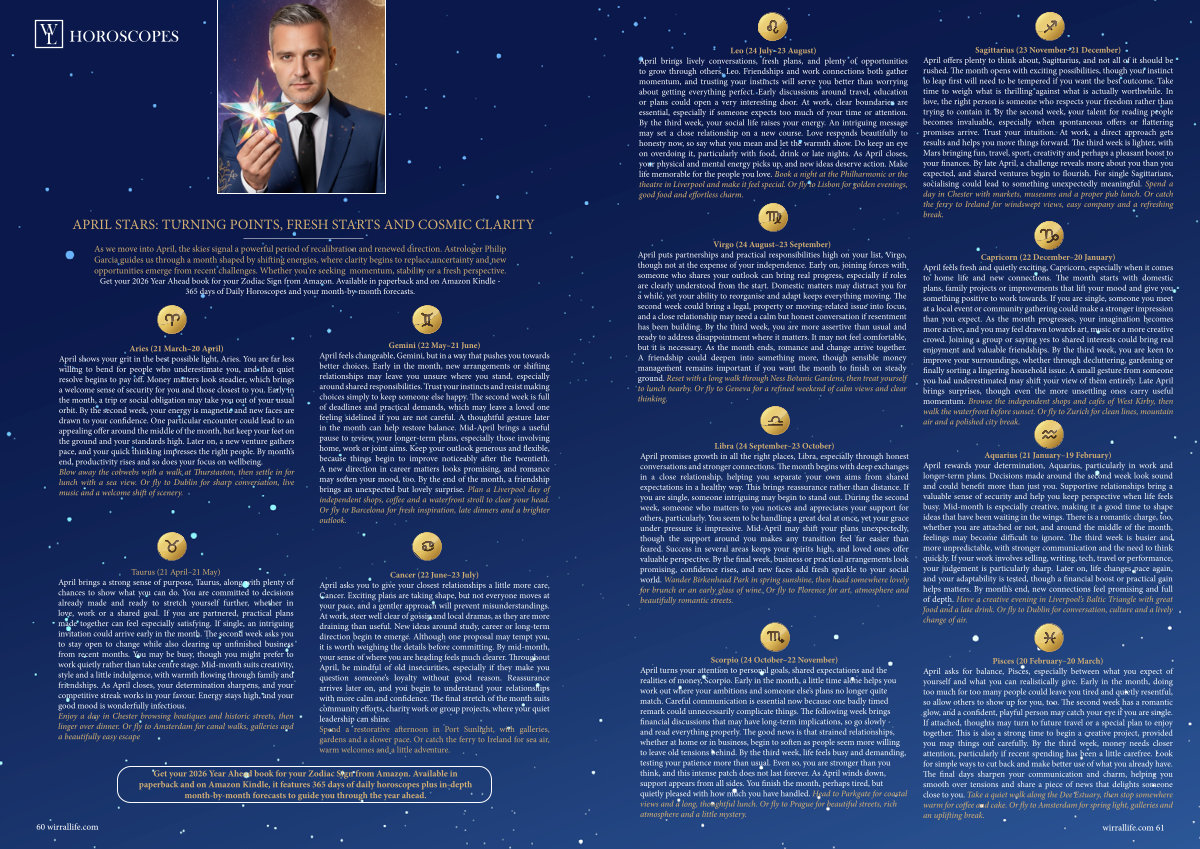 As we move into April, the skies signal a powerful period of recalibration and renewed direction. Astrologer Philip Garcia guides us through a month shaped by shifting energies, where clarity begins to replace uncertainty and new opportunities emerge from recent challenges. Whether you ' re seeking momentum, stability or a fresh perspective. Get your 2026 Year Ahead book for your Zodiac Sign from Amazon. Available in paperback and on Amazon Kindle- 365 days of Daily Horoscopes and your month-by-month forecasts.