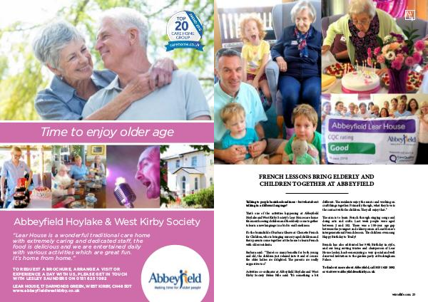 Time to enjoy older age Abbeyfield Hoylake & West Kirby Society “Lear House is a wonderful traditional care home with extremely caring and dedicated staff, the food is delicious and we are entertained daily with various activities which are great fun. It’s home from home.” TO REQUEST A BROCHURE, ARRANGE A VISIT OR EXPERIENCE A DAY WITH US, PLEASE GET IN TOUCH WITH LESLEY SAUNDERS ON 0151 625 1092 LEAR HOUSE, 17 DARMONDS GREEN, WEST KIRBY, CH48 5DT www.abbeyfieldwestkirby.co.uk