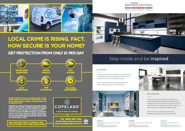 LOCAL CRIME IS RISING. FACT. HOW SECURE IS YOUR HOME? GET PROTECTION FROM ONLY £1 PER DAY KEYHOLDING & RESPONSE MOBILE PATROLS CCTV SYSTEMS CCTV MONITORING FIRE PROTECTION FACILITIES MANAGEMENT Copeland Group Services is a trusted provider of high quality Security and Facilities Management services for the Wirral, Chester, Liverpool and North Wales and throughout the UK. Copeland has a wealth of industry experience working with an impressive client portfolio of leading organisations providing quality driven Security, CCTV, Remote Monitoring and Facilities Management services nationally. Our integrated and tailored approach to Security and Facilities Management, combined with a proven track record of achieving consistently high standards, ensures a truly comprehensive and customer focused service across all three divisions supported around the clock by our 24 Hour National Support Centre. CALL OUR TEAM TODAY TO FIND OUT HOW WE CAN SECURE YOUR HOME AND BUSINESS PEACE OF MIND AS STANDARD Tel: 0800 955 4414 (24 HR National Support Centre) www.copelandgroupservices.com