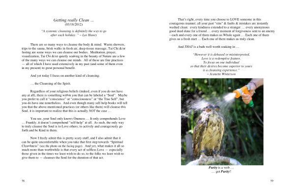 Now I freely admit this is pretty scary stuff , and I also admit that it can be quite uncomfortable when you take that first step towards “ Spiritual Cleanliness ” ( see the photo on the facing page ). And yet , what makes it all so much more than worthwhile is that every act of selfless Love — especially those given in the times we least wish to do so , to the folks we least wish to give them to — cleanses the Soul for the duration of that act .