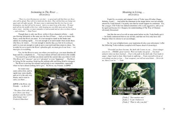Though there is only one River , within it flows channels infinite — each one flowing ultimately to the same sea ; the Sea of Peace … And yet to know this Peace , swim the River you must . It is not enough to stand on the banks and admire its crashing rapids … It is not enough to sit and wonder what awaits those who brave its waters … It is not enough to merely dip your foot in its coolness ; and it is even not enough to wade in up to your neck and then return to shore . No , in order for us to receive the River ’ s priceless gift , we must give It our lives — we must give it everything .